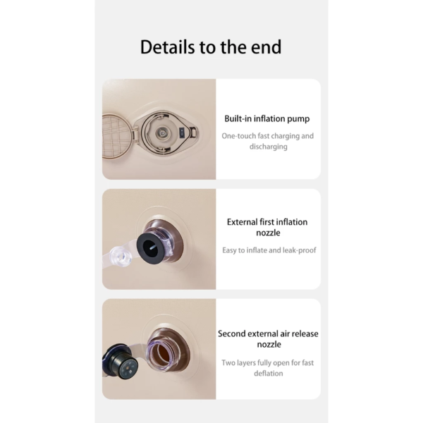 - Built-in pump with 2000 mAh battery capacity; inflates after 2 minutes